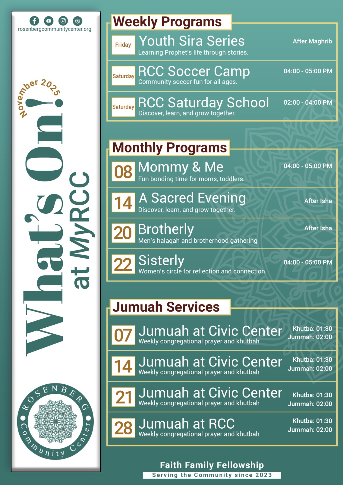 Our center serves as more than just a mosque for prayers; it is a welcoming community center for everyone. We are dedicated to preserving an Islamic identity and promoting a comprehensive way of life based on the Holy Quran and the Sunnah of Prophet Muhammad (PBUH). Our mission is to nurture future leaders within our community, champion Islam, and foster a moral and ethical paradigm for the prosperity of our community and humanity. Through strengthening families, creating a sense of belonging and empowerment, and cultivating upright leaders, we aim to build a lasting legacy and have a positive impact.